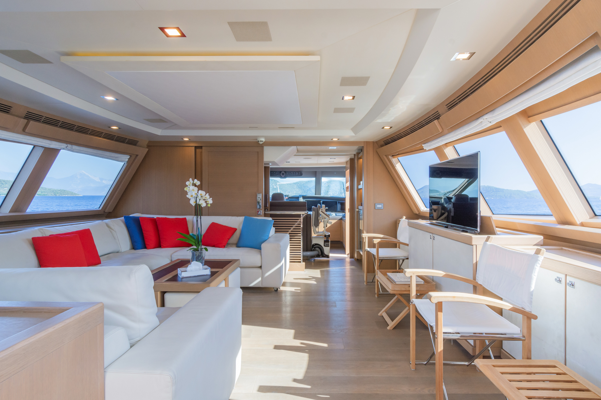 The main deck aft offers another sheltered dining/lounge setting with huge sofas, occasional chairs plus another flexible tables system making the space perfect for dinner, drinks or coffee.