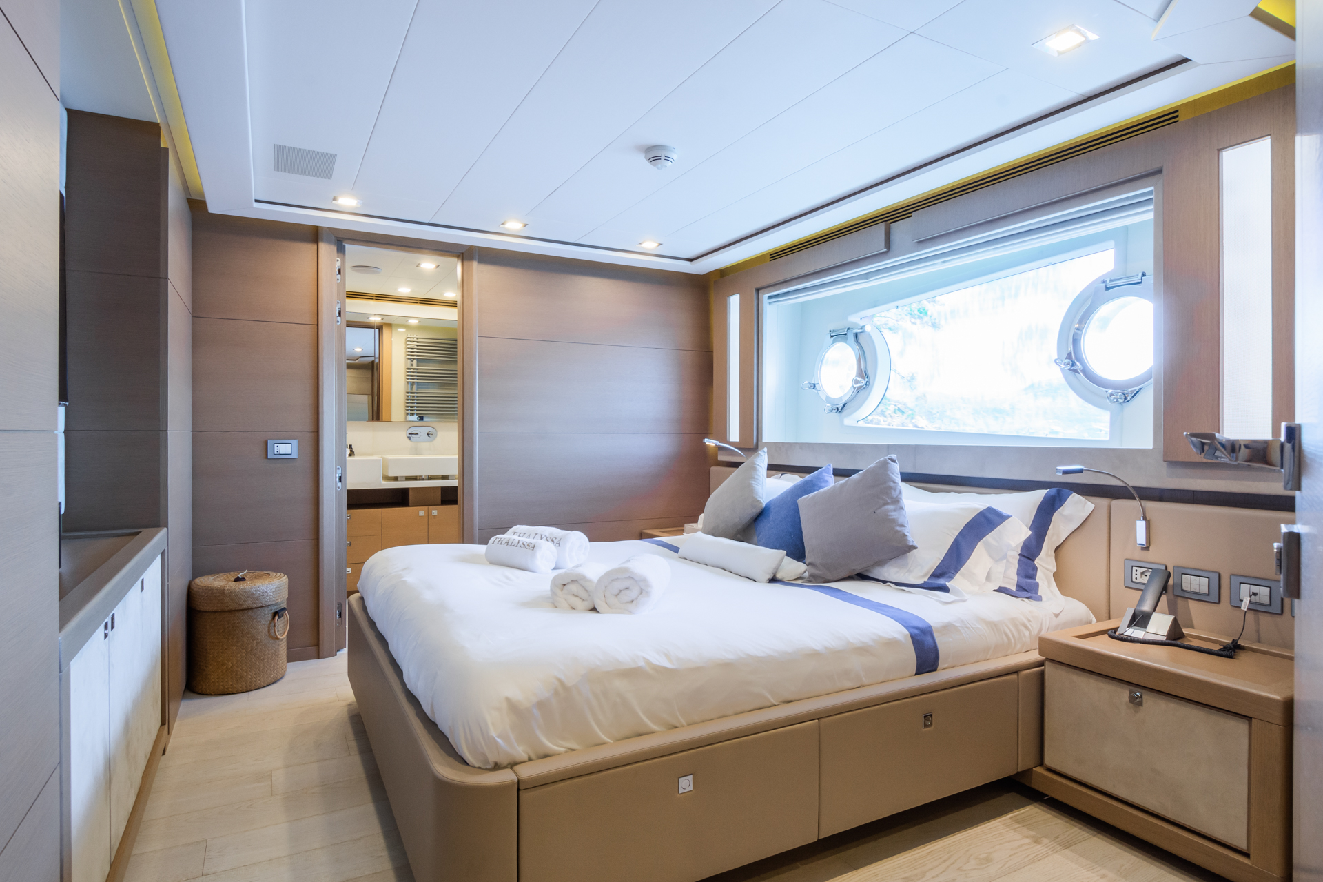 The upper deck aft is a huge sociable area with a covered dining table, lounge/dining arrangement amidships with a flexible table and aft sun beds.