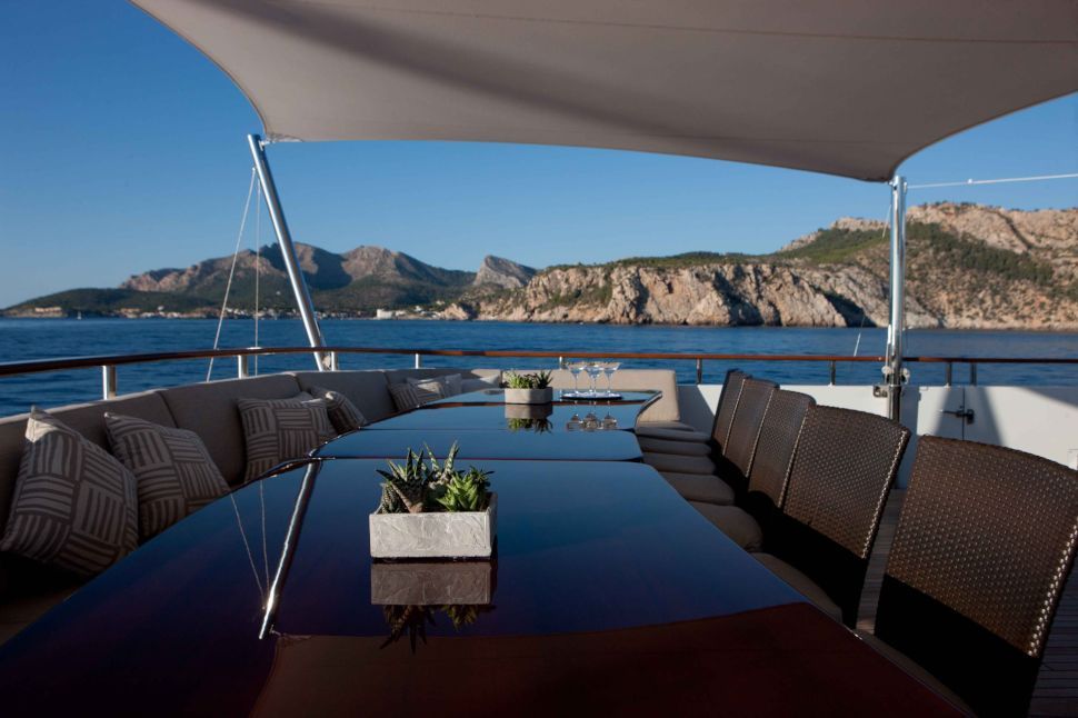 Yacht MIRAGE offers a generous deck plan; the aft deck features an alfresco dining option and cocktail seating, ideal for enjoying a sundowner at the custom-built high gloss wet bar. Above the main deck, the sundeck is roomy and open with an alfresco dining option, removable Bimini cover and extra comfortable lounge chairs.