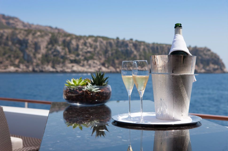 Yacht MIRAGE offers a generous deck plan; the aft deck features an alfresco dining option and cocktail seating, ideal for enjoying a sundowner at the custom-built high gloss wet bar. Above the main deck, the sundeck is roomy and open with an alfresco dining option, removable Bimini cover and extra comfortable lounge chairs.