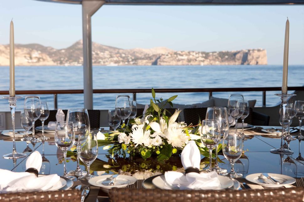 Yacht MIRAGE offers a generous deck plan; the aft deck features an alfresco dining option and cocktail seating, ideal for enjoying a sundowner at the custom-built high gloss wet bar.