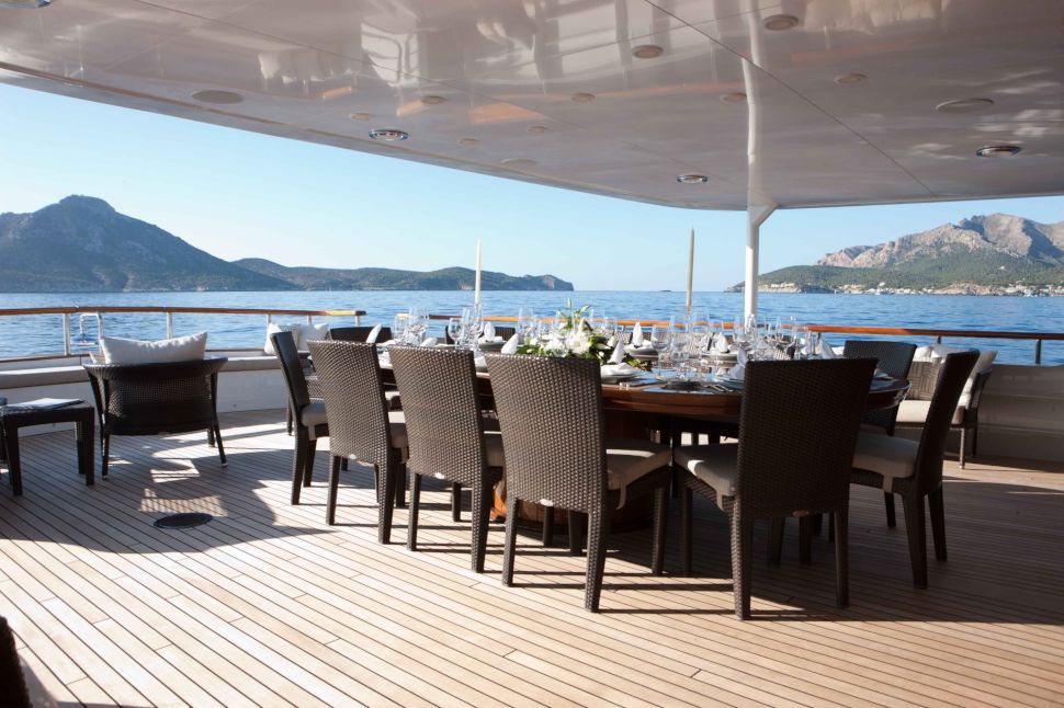 Yacht MIRAGE offers a generous deck plan; the aft deck features an alfresco dining option and cocktail seating, ideal for enjoying a sundowner at the custom-built high gloss wet bar.