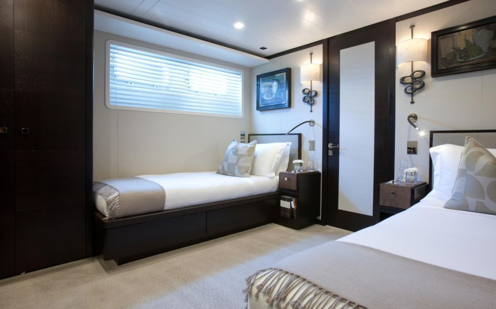 The hull is a solid steel displacement build, measuring 53.01 m (173' 11") and can accommodate 12 guests in 8 deluxe cabins, while she has a professional crew of 14.