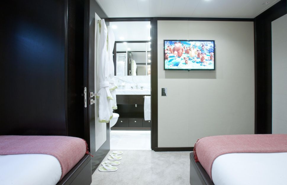 The hull is a solid steel displacement build, measuring 53.01 m (173' 11") and can accommodate 12 guests in 8 deluxe cabins, while she has a professional crew of 14.