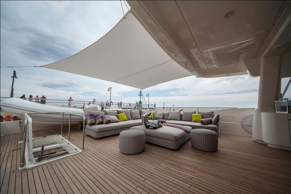 The LE PETIT BATEAU motor yacht has a massive flybridge aft of the pilot house with plenty of generous plush outdoor seating and an optional Bimini cover.