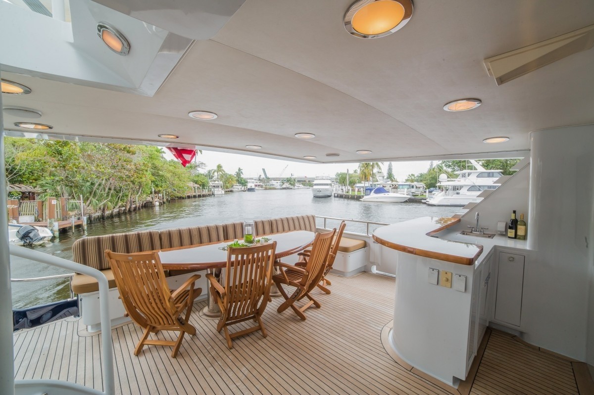 Above the main deck the sun deck boasts a social atmosphere complete with ample outdoor seating, chaise lounge style sun pads a small more intimate alfresco dining option and a wet bar.