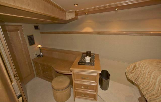 The salon and dining are an open plan, aft the salon offers a large sofa, comfortable occasional chairs, 2 coffee tables and a games / cocktail table; forward the formal dining space is adorned with a lovely dark wood table and high back seating.