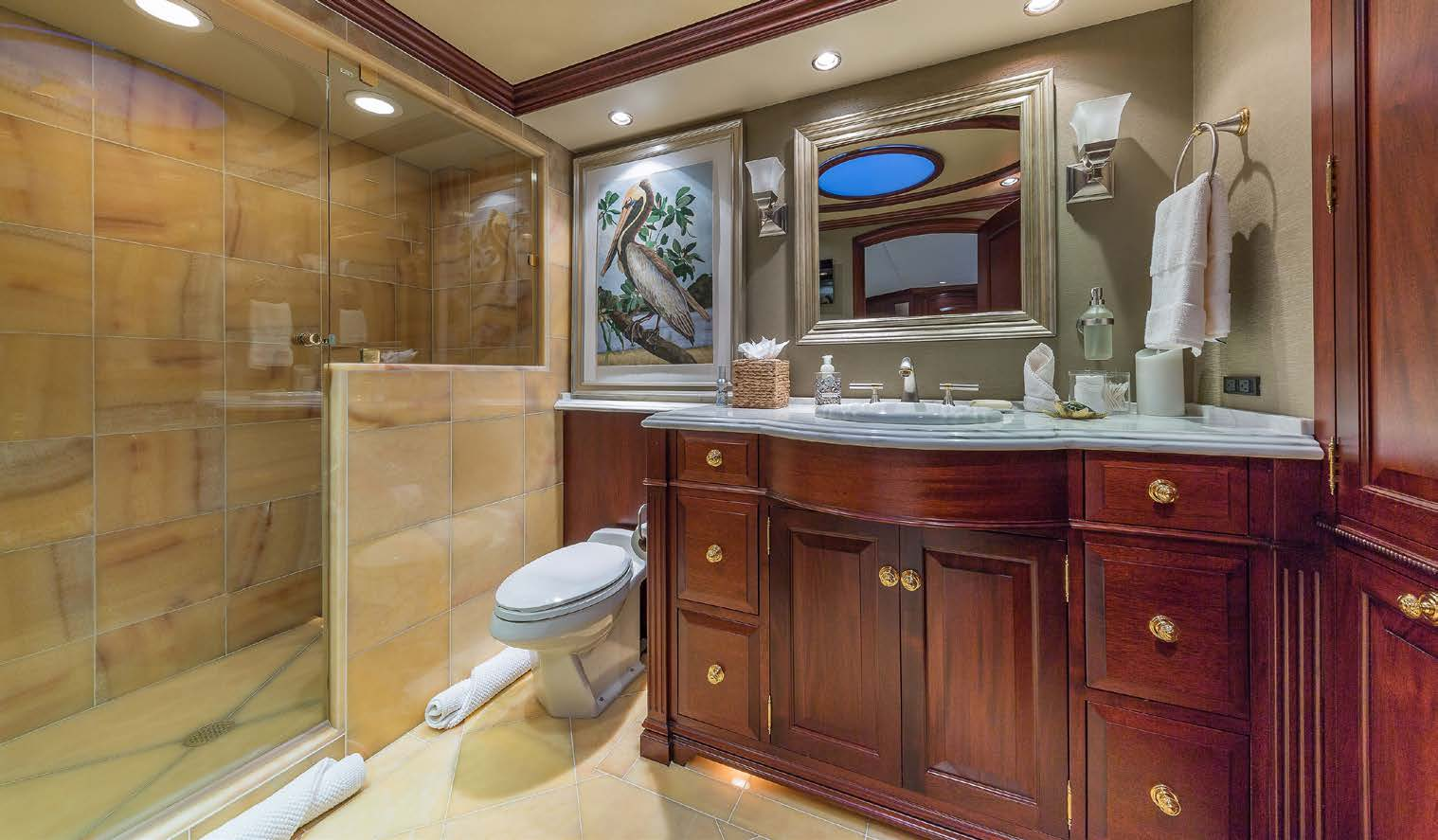A further 4 cabins are on the lower deck, 2 with king size beds, 1 with a queen size bed and 1 with a double and a twin bed, all cabins feature beautiful mahogany finishes and fine marble and offer en-suite facilities.