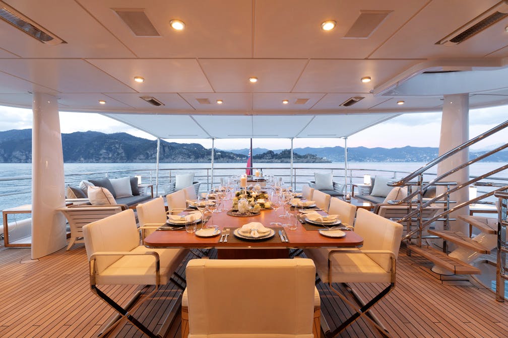 The upper deck has a large alfresco dining table designed for more intimate meals between eight guests.