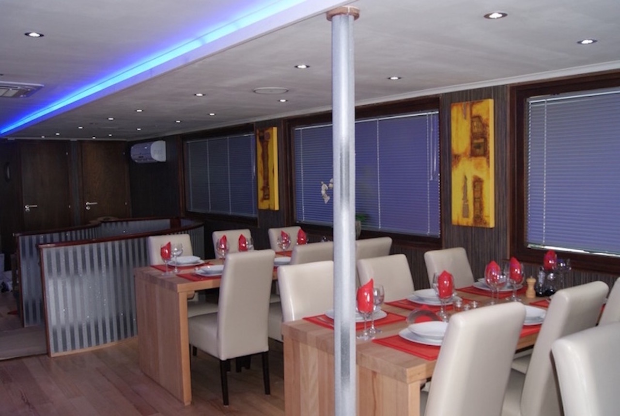 The vast and elegant interior salon can be found on the top deck, providing excellent views and light atmosphere thanks to the large side windows. Here all guests can find enough space to relax and unwind while dining or simply enjoying a drink at the yacht bar.