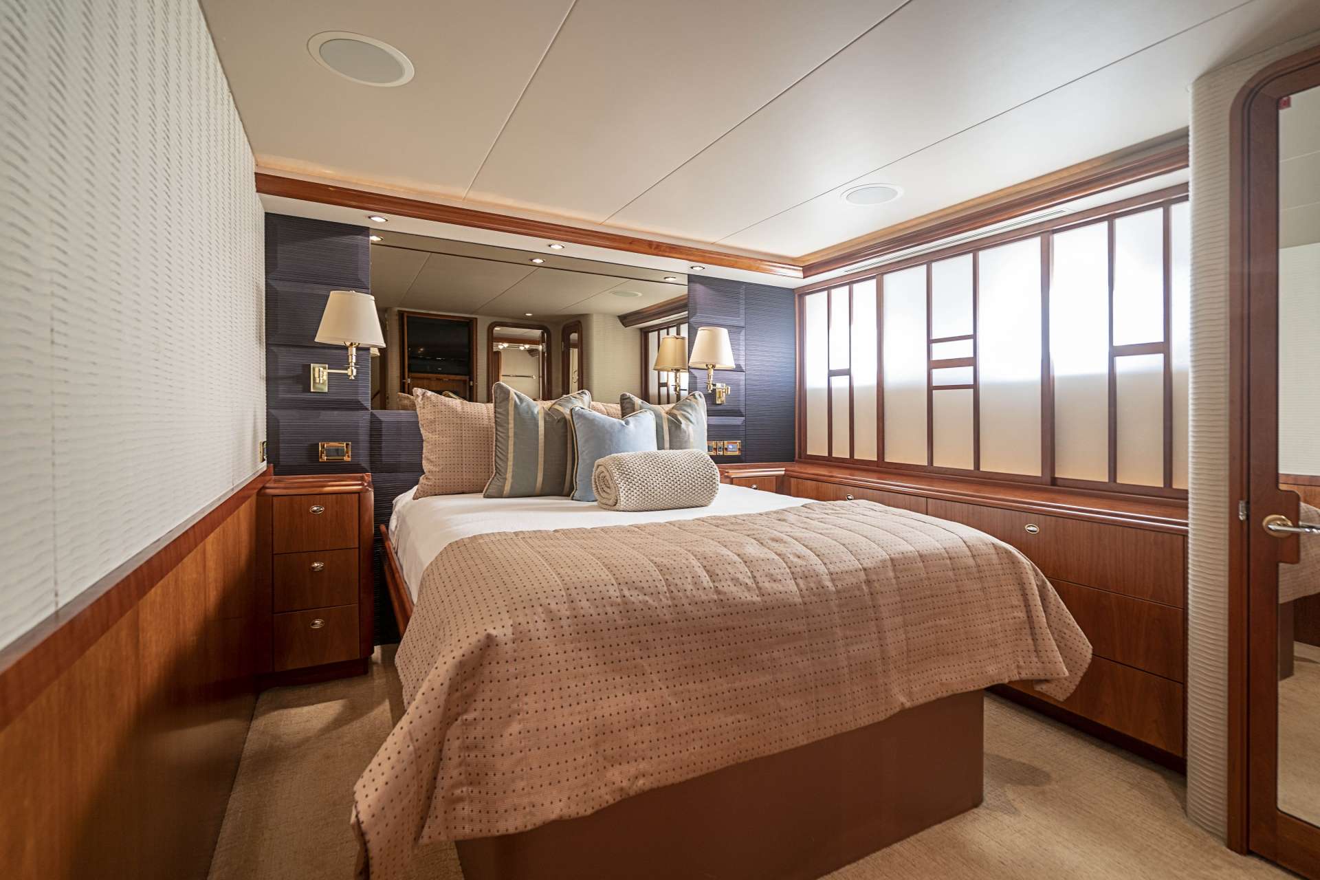 The VIP guest stateroom is situated forward of the galley while the master stateroom and two queen guest staterooms are placed amidships, down below the
