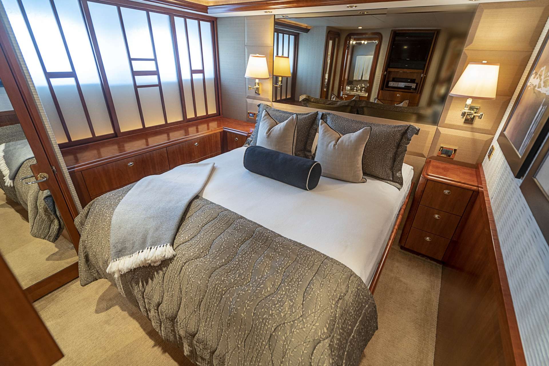 The VIP guest stateroom is situated forward of the galley while the master stateroom and two queen guest staterooms are placed amidships, down below the