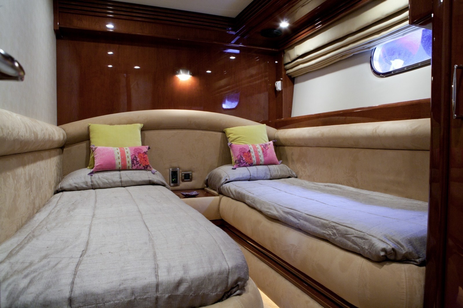 Motor Yacht LUDI accommodates 8 guests in 4 spacious cabins. The master cabin is full beam of the yacht amidships boasting a love seat, ample storage and his and hers rest rooms (one with a tub). A VIP cabin is forward and full beam of the yacht with en-suite facilities and shower.