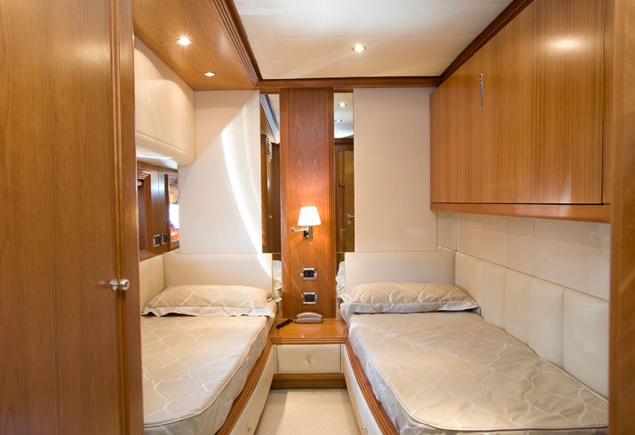 The Alalunga 85 Sport yacht YUMI features a traditional layout with four cabins including a master cabin, a VIP cabin, and two twin cabins.