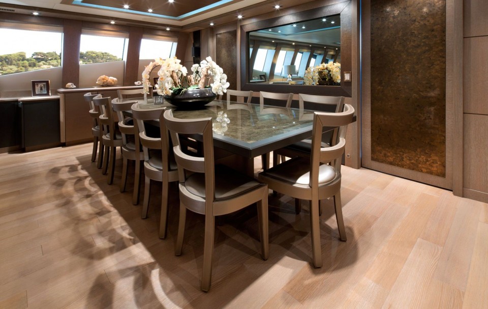 Guests have an additional outdoor relaxation on the bow, where an alfresco seating area with a table and a large ...