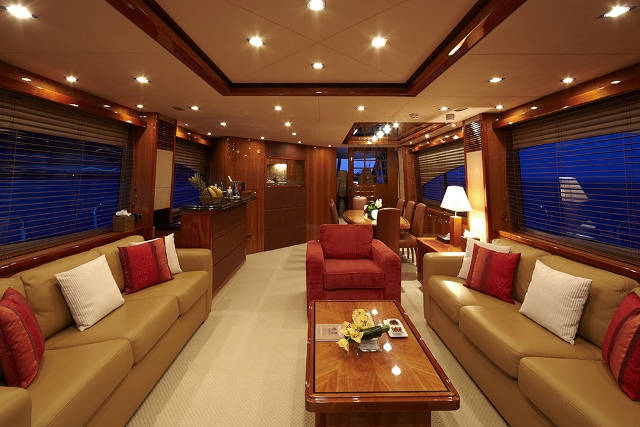 The salon features 2 cream leather sofas, 2 occasional chairs a coffee table and full length windows providing ample natural light. Forward of the salon in a semi open plan the formal dining table seats guests in style. Aft of the salon guests can enjoy spacious shaded seating and an alfresco dining option on the aft deck.