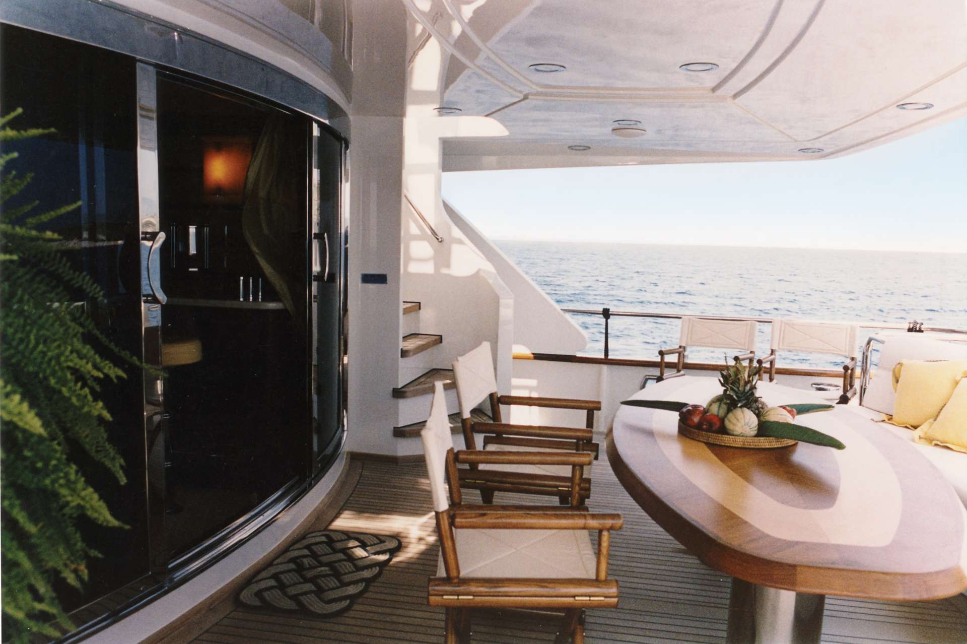 On deck, guests will find outdoor living spacious and relaxed. Stepping aboard LADY MOH, the aft deck is partially shaded and features an alfresco dining option at a beautifully appointed oval table with custom built in seating and chairs.