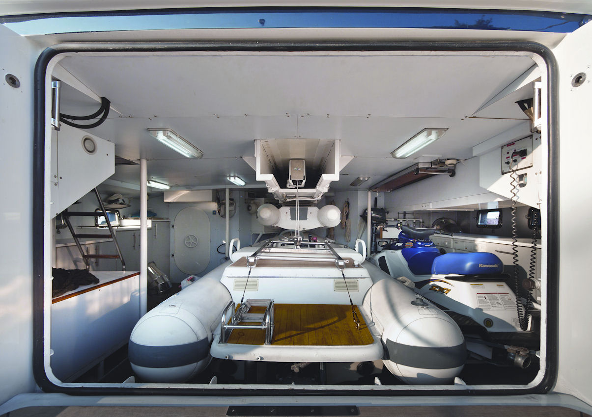 The transom offers port and starboard steps leading to the extended swim platform, a garage houses many great water sports toys including 2 tenders, Jet Ski, water skis, diving equipment and more.