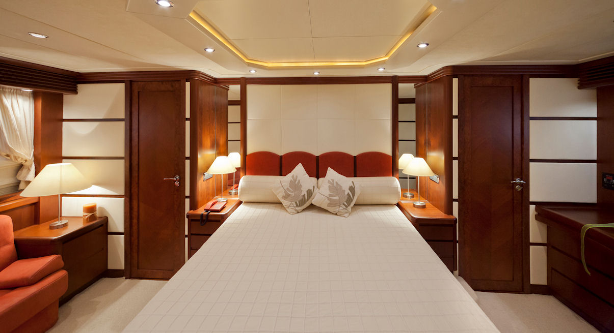 Luxury, style and comfort describe the accommodation aboard the LADY MOH motor yacht. The master stateroom is on the main deck and forward, full beam of the yacht the cabin offers a center lined double bed, love seat, desk, separate vanity area and en-suite with Spa Pool hydro massage.