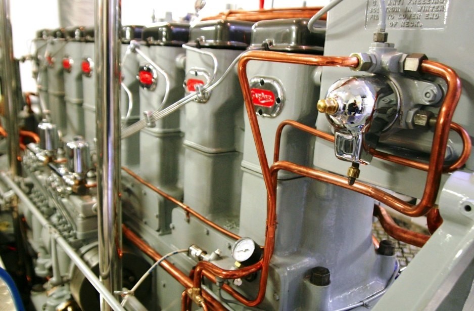 A fabulous feature in the lounge is a glass floor section, which gives views into the immaculate and totally rebuilt Gardner diesel engines below.
