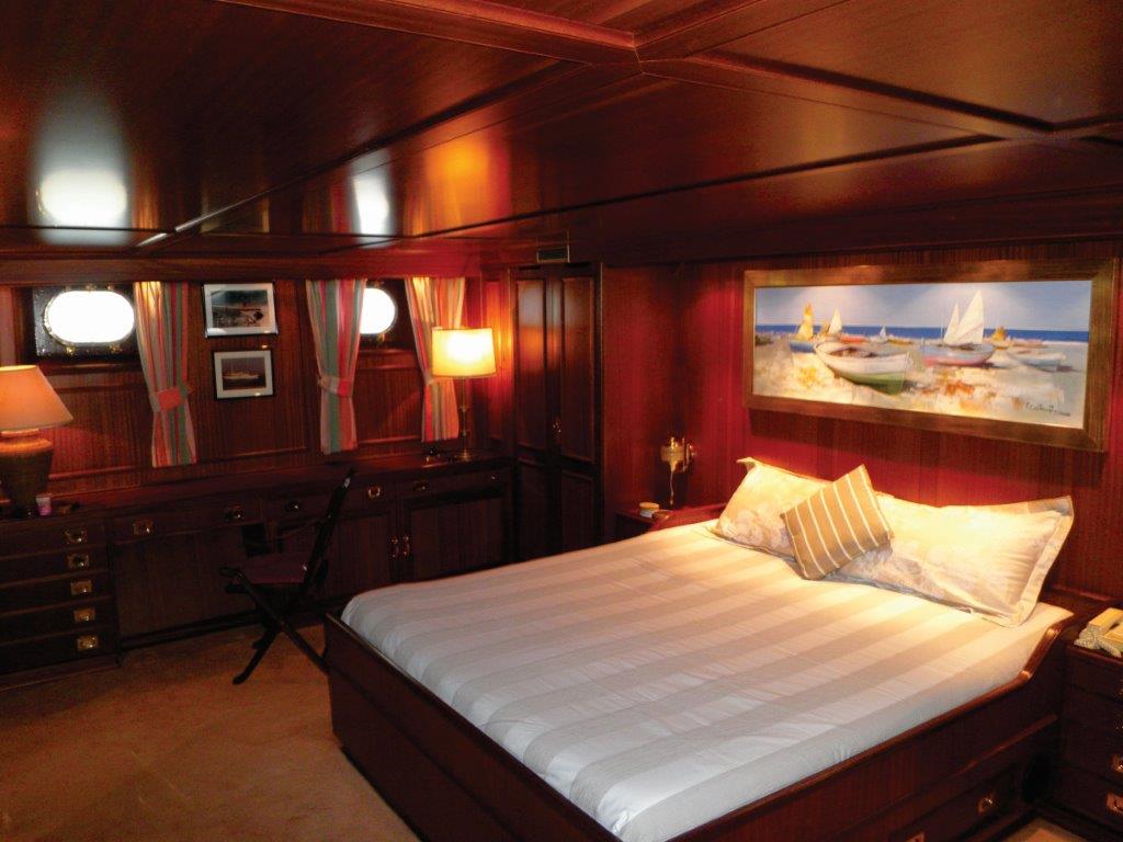 The vessel provides spacious, king-sized master cabin, along with two large twin cabins. All of these have en-suite bathrooms. There is also a forward intimate double cabin with en-suite bathroom, ideal for children or a nanny.