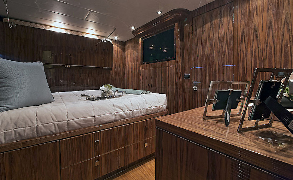The main salon is an open plan, with a lavish dining table and a lounge area. The guest will enjoy relaxing on plush furniture while having a chat with a cup of coffee and sipping some delicious cocktails. Exterior spaces host great modern amenities and provide total comfort for charter guests aboard Gigi II.