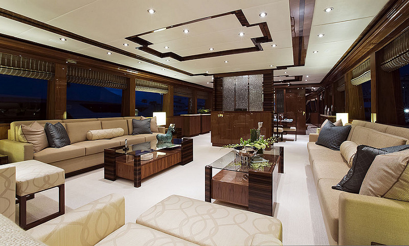 The main salon is an open plan, with a lavish dining table and a lounge area. The guest will enjoy relaxing on plush furniture while having a chat with a cup of coffee and sipping some delicious cocktails. Exterior spaces host great modern amenities and provide total comfort for charter guests aboard Gigi II.