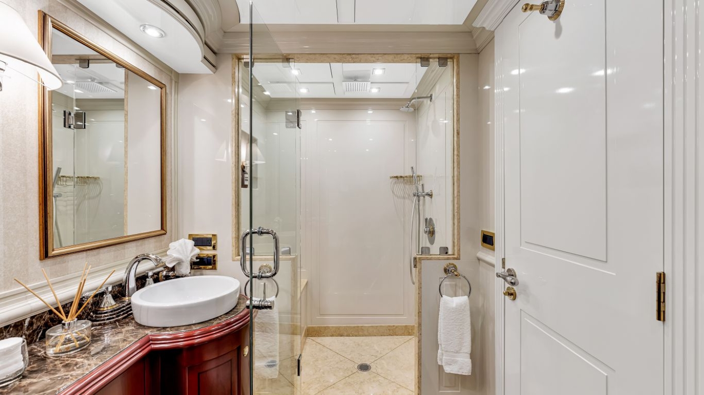 The salon is light and airy thanks to the panoramic windows and features a large lounge area for 8 guests on an L shaped plush sofa and 2 occasional chairs. A pop up flat screen TV/DVD and stereo system sits adjacent for optimum entertainment.