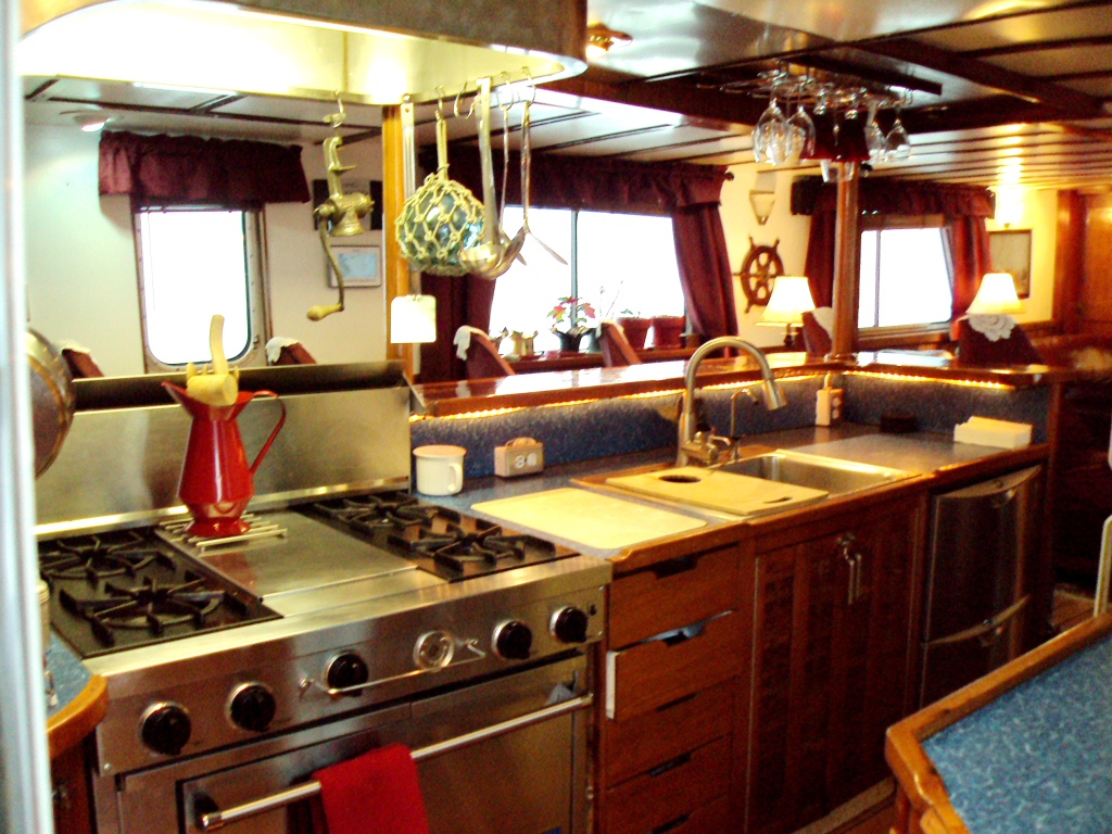 The bar area with its six stools represents the elegance yet comfort you will feel while dining amid the fragrant smells of our galley and the possibly observing the talents of our onboard chef. Six to eight guests may dine comfortably.