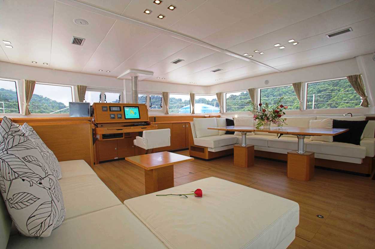 Sailing yacht JYOHANA has a modern and spacious open plan salon. Light woods complement cool elegant colours and large windows allow plenty of natural light and panoramic views from the salon and internal lounge and dining area.