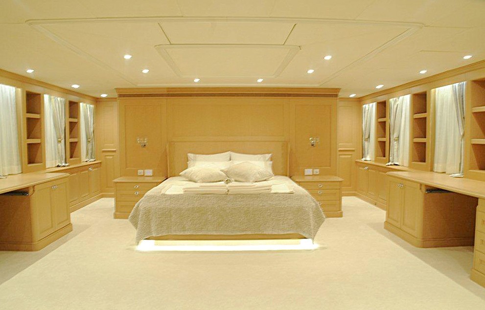 The master suite is on the upper deck aft of the pilothouse boasting a full beam cabin, king size bed, panoramic views and private deck. Below decks, a VIP cabin is a full beam of the yacht with a queen size bed. Also on the lower deck is a further two double cabins with double beds and two twin cabins with side by side single beds.