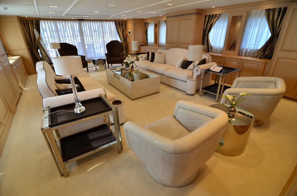 The salon features ample seating in a social atmosphere with two large sofas, four comfortable occasional chairs and coffee tables. Subtle cream carpets, beach toned wood panels and plenty of natural light enhance the spacious feel. Forward of the salon, a low island credenza gives casual separation to the formal dining area.