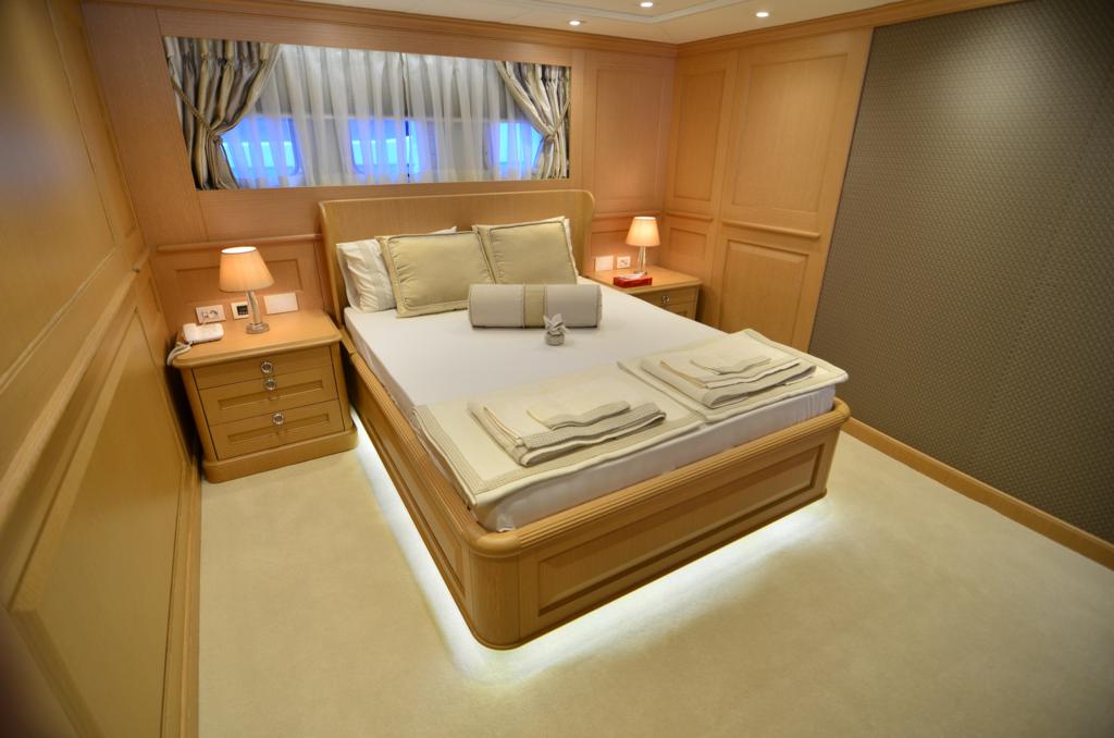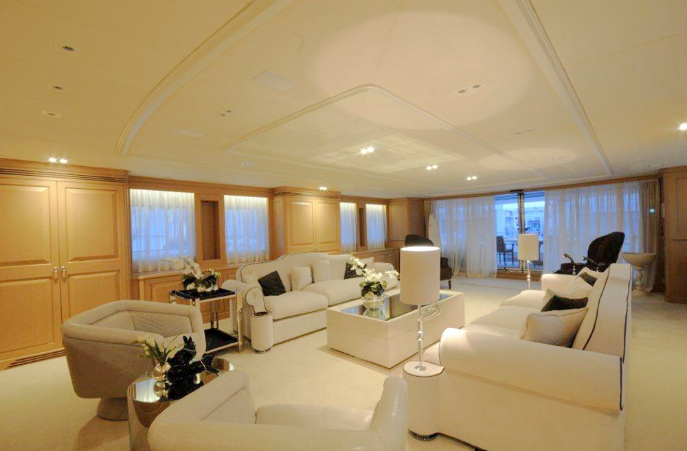 Above, the upper deck has a private aft deck and a fabulous relaxing area dedicated to the master cabin. The top deck is perfect for entertaining and sunning, complete with a partially retractable roof, Spa Pool tub, sun pads, turntable sound system and helipad.