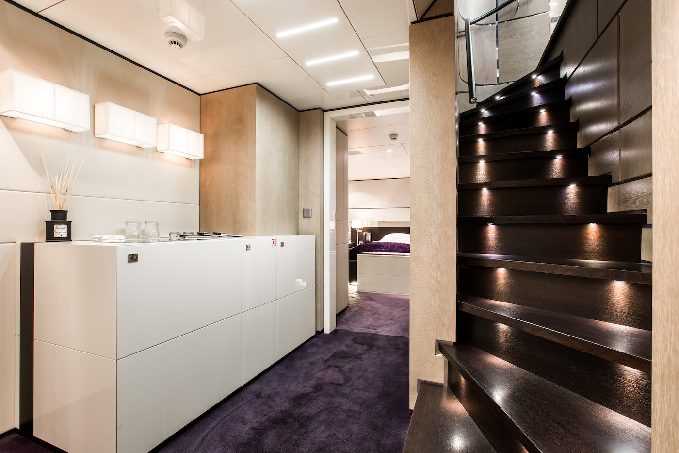 Forward, there is a raised Jacuzzi and sunbeds are placed on either side for drying off in the sunshine while enjoying the panoramic forward views.