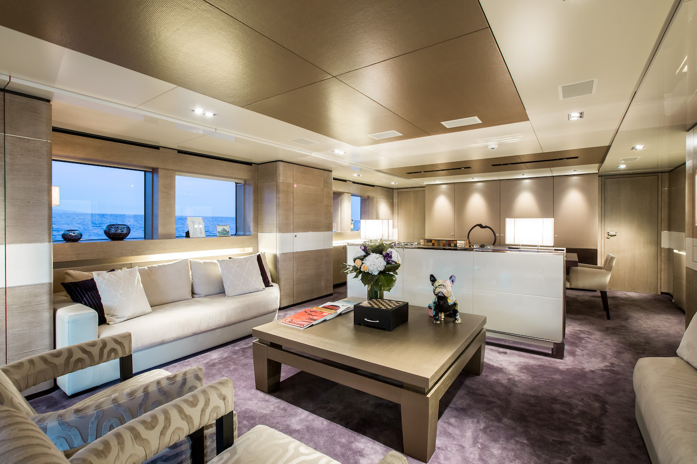 A sun umbrella in each corner allows guests to choose between shade and full sunlight. Beneath the sundeck overhang, there is bar seating to starboard and to port a large sofa/sunbed with a widescreen TV above.
