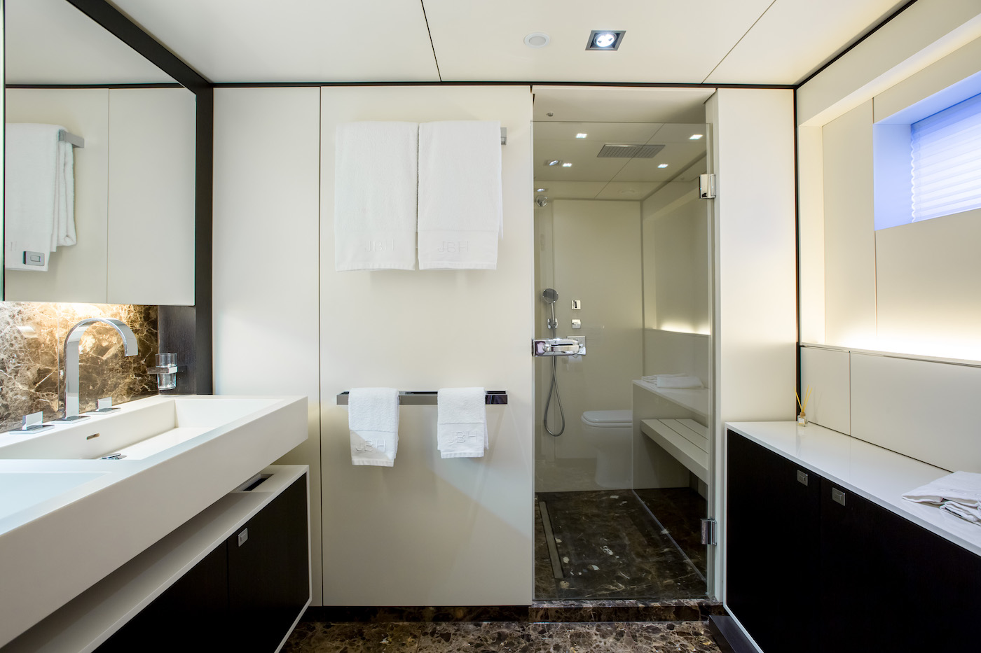Forward, there is a raised Jacuzzi and sunbeds are placed on either side for drying off in the sunshine while enjoying the panoramic forward views.