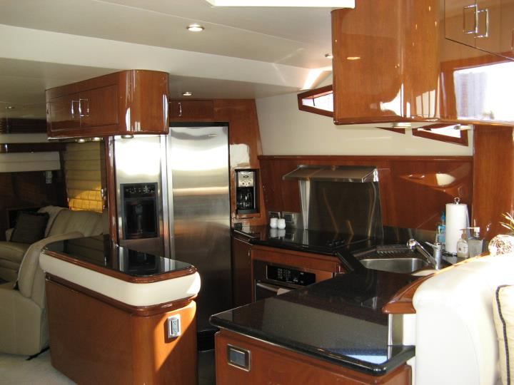 The galley is laid to port boasting fine dark marble counter tops and high end stainless steel appliances. Forward of the dining / galley area the helm station offers additional leather seating in a U shaped sofa with small table.