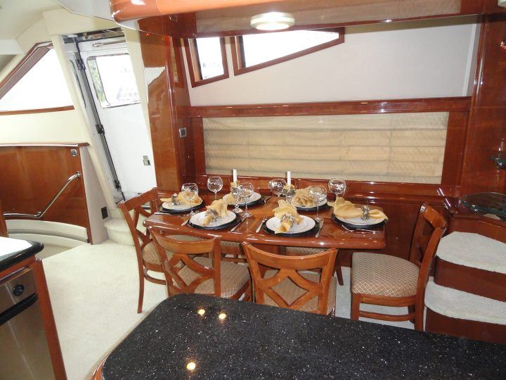 Forward of the salon the formal dining table for 6 is placed to starboard. The galley is laid to port boasting fine dark marble counter tops and high end stainless steel appliances. Forward of the dining / galley area the helm station offers additional leather seating in a U shaped sofa with small table.