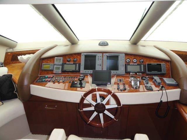 Forward of the dining / galley area the helm station offers additional leather seating in a U shaped sofa with small table. Guest’s access the staterooms forward of the dining area, also giving direct access to the deck through a sliding door on the starboard side.