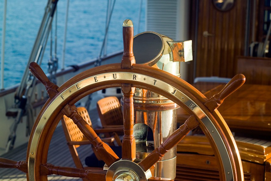 The aft deck is spacious with an alfresco dining option and optional Bimini cover, aft is additional seating and a traditional helm and binnacle. FLEURTJE has wide decks, easy to maneuver around all the way forward.