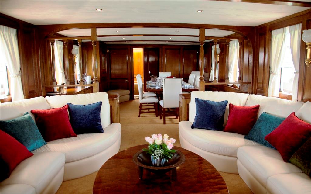 Further aft a passage gives access to the salon and dining, plus the owner’s and guest accommodation. The salon and dining are in an open plan featuring traditional deck heads with wood beams, oak panels and large windows, ...