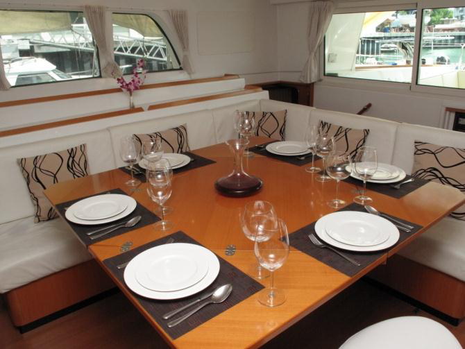 The cockpit table can be stored or used for breakfast lunch or dinner al fresco dining. There is a built-in cupboard in the cockpit for the fridge, ice-maker and a sink. From the transom, wide steps and a built in stainless steel swimming ladder lead to the sea where you can enjoy some snorkelling, swimming or paddling.