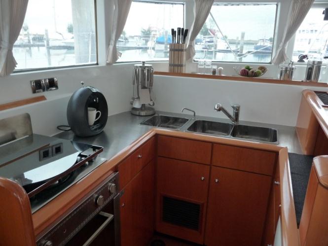 The fully equipped galley positioned slightly below on the port side has a four-burner hob with automatic lighting, a large oven and grill, a fridge and a double-drawer dish-washer and micro-wave.