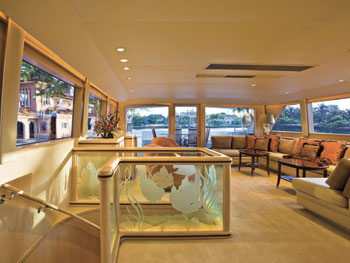 The salon and dining are an open plan featuring the salon aft and the formal dining space forward. An elegant neutral decor of light tones with a large U shaped sofa to port and occasional chairs to starboard create a welcoming setting. Forward the formal dining table seats 8 easily.