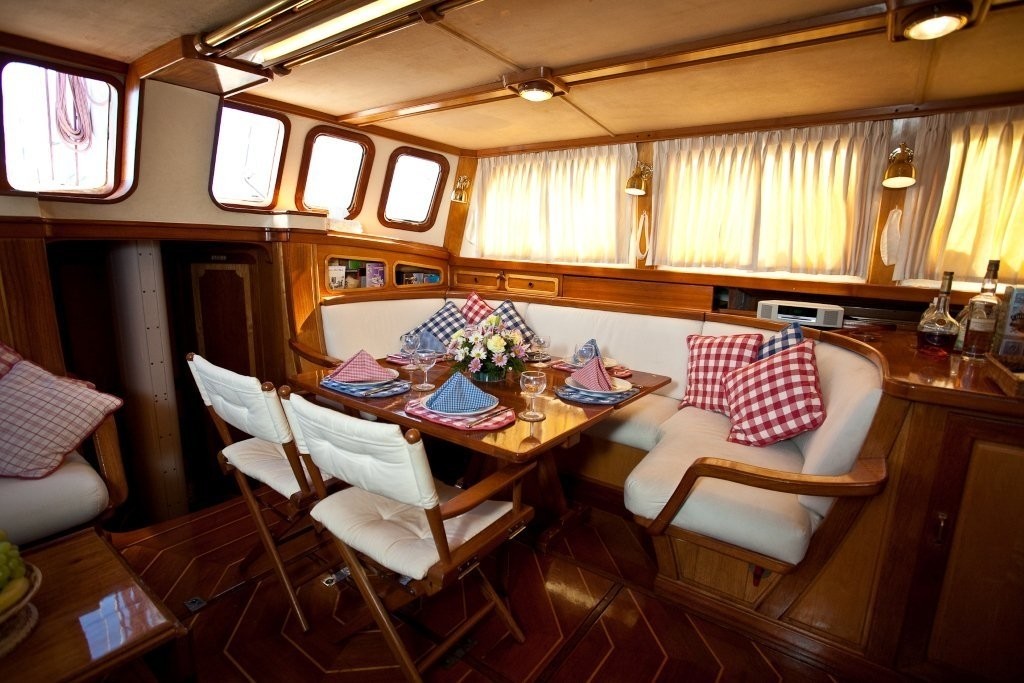 Her Master Cabin is very spacious and private; with King size berth, a settee, and a library writing desk and bar. The Master bathroom has a full size conventional bath tub, a hand crafted wooden wash basin and electric w.c.