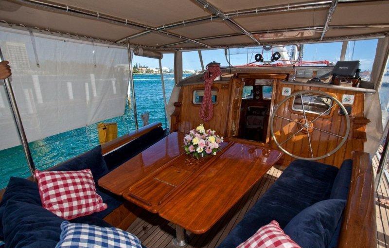 The cockpit area has a dining table covered by a hard Bimini top, perfect for enjoying breakfast lunch or dinner. Forward of the cockpit is the wheelhouse and navigation area. A few steps lead down to the main salon with a u-shaped couch and table for interior dining to starboard and further seating to port.