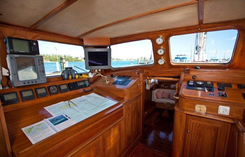 Forward of the cockpit is the wheelhouse and navigation area. A few steps lead down to the main salon with a u-shaped couch and table for interior dining to starboard and further seating to port. The salon benefits form large windows making it feel spacious.