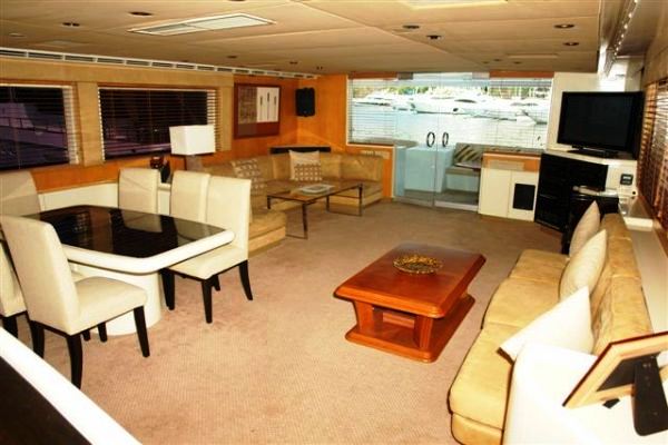 The salon and dining are an open plan with the lounge aft featuring large U shaped sofa coffee table on the starboard side and an additional sofa and entertainment system on the port side.