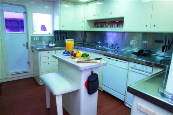 Forward of the salon the formal dining table is a lovely dark tone, creating a custom tailored look. A day head is available forward of the salon. The Master cabin is further forward.