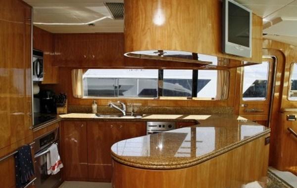 Forward and separate of the salon, the galley boasts a country style kitchen and dining table forward, the dining table benefits from being slightly raised and therefore features optimum viewing.